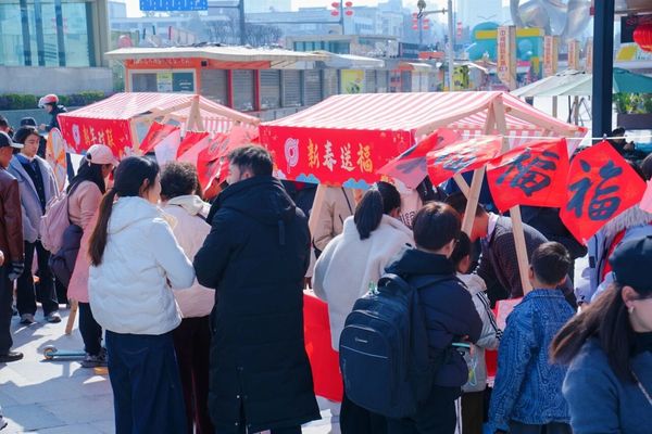 最热闹的当属非遗体验区。“新春送福”“新年对联”摊位前排起了长龙,居民捧着红纸,纷纷“定制”专属祝福。“老师,给我写个‘平安喜乐’!”“我要‘马上发财’!”书法志愿者们挥毫泼墨,一副副墨迹未干的福字和春联,转眼就被笑盈盈地捧走了。