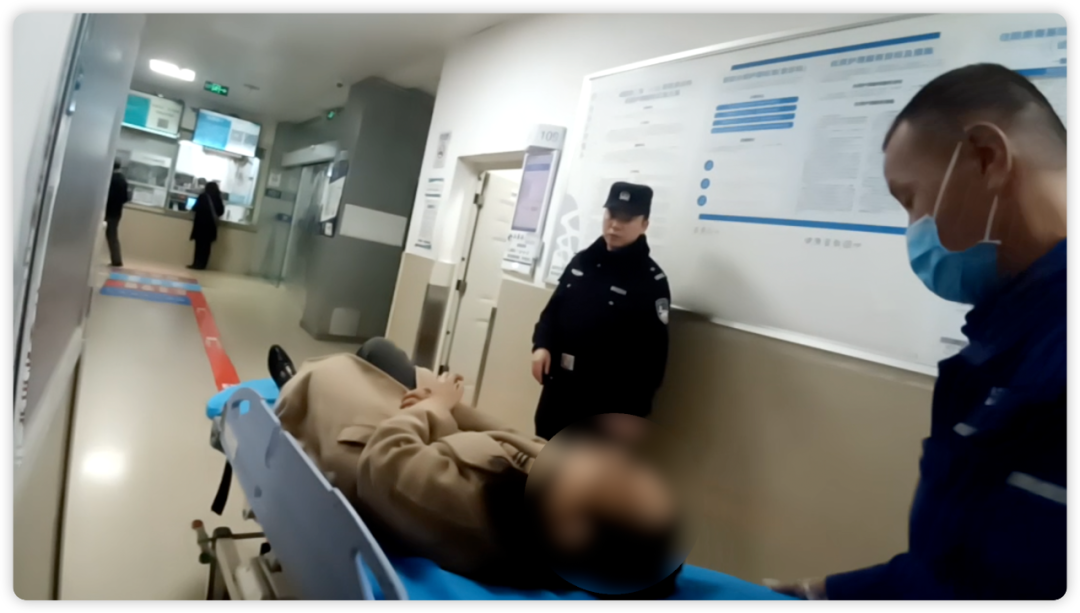 接警后,民警王浩权、辅警彭昆迅速抵达现场。车内,民警发现女士面色苍白,双手无力。"走!我们送您去医院!"两人果断将女士带上警车,拉响警报,仅用时五分钟便将周女士送至就近医院。抵达医院后,他们小心翼翼地将周女士扶上担架,直至医护人员全面接手,确认女士得到妥善照顾后,两位民警才安心离开。